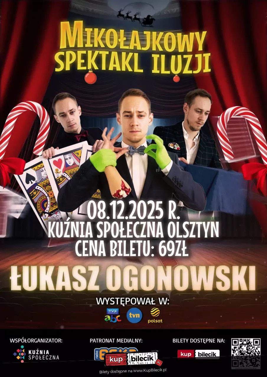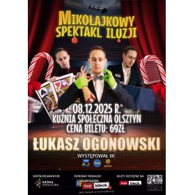 bilety: Łukasz Ogonowski - nowoczesny iluzjonista, znany z wielu występów telewizyjnych, na antenach takich stacji jak TVP, TVN czy Polsat, na co dzień realizujący pokazy na imprezach firmowych największych marek polskiego czy międzynarodowego rynku. Członek najsłynniejszej grupy Champions of Illusion, swoimi występami od 20 lat zadziwia publiczność w całym kraju oraz Europie. Więcej informacji, w krótce! Bilety do nabycia na: KupBilecik.plMikołajkowy Spektakl Iluzji artyści: Łukasz OgonowskiŁukasz Ogonowski - nowoczesny iluzjonista, uczestnik VII edycji programu "Mam Talent". Członek najsłynniejszej grupy Champions of Illusion. Swoimi występami od 15 lat zadziwia publiczność w całym kraju oraz Europie. Czarował również dla reprezentacji Polski w piłce nożnej oraz nawet dla samego prezydenta Andrzeja Dudy. Bilety do nabycia na: KupBilecik.pl |